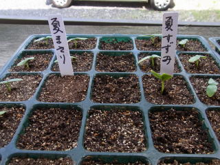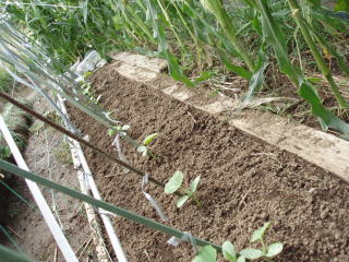 ポットに2〜3粒まき、発芽後1本に間引きし、本葉2〜3枚で定植します。畑には前以て1u当たり堆肥3s、苦土石灰100g、化成肥料100gを施しておきます。