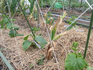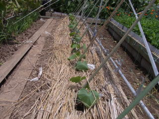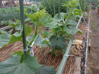 幅2m、株間50pに定植し、最初に伸びたつるの7〜8節までに咲いた雌花や脇芽は早めに取り除きます。株元に落ち葉や刈草などを敷くと、雑草防止や乾燥、果実の汚れ防止などに効果的です。果実がなり始めたら30gの化成肥料を数回施してください。果実の短い株が3%程度発生しますが、食味には問題ありません。