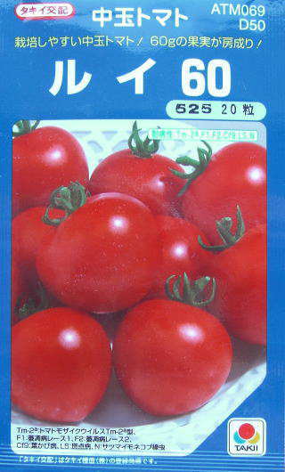 熟期は早生で果重は約60g。果色は濃い赤。草勢は強いが異常茎(メガネ)の発生は少ない。葉カビ病に強い耐病性。家庭菜園にも最適。