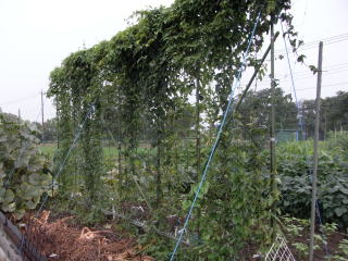 ツルネットは茎葉が生茂り、秋の台風に耐えなければなりませんので頑丈さが求められます。ネット面の支柱に両側からロープを2〜2.5mに一対張りますとかなりの頑丈さになりますので、結果は良かったです。地上面のロープ支持部は50p以上地中に挿しこめる丈夫な資材が必要です。