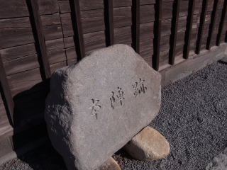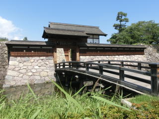 本丸の裏口に設けられた門です(太鼓門と同様に櫓門と高麗門によって桝形を形成する桝形門です)。十八世紀中ごろに行われた千曲川の改修以前は、門が河川敷に接していたことから、『水之手御門』と呼ばれることもありました。絵図資料をもとに、当時の門礎石をそのまま利用し忠実に復元しました。櫓門は石垣に渡らずに独立しており、中世的な(江戸期以前)様相を残した松代城の特徴的な門です。