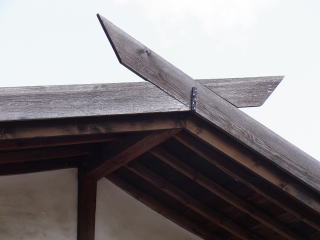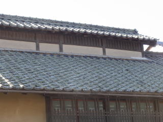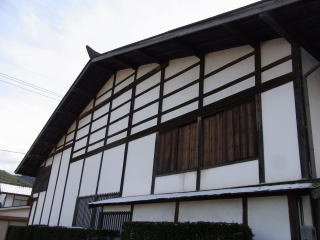 総二階建てで切妻造りの妻入り、出桁造りです妻入りとしたのは、建物の短辺に梁を架けないと、総二階建てですから、いっそう棟の高い建物になるためと思われます。
