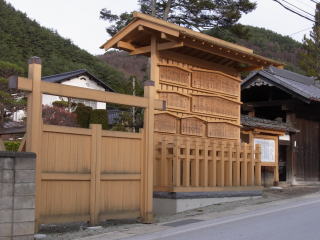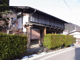 「久右衛門」を代々襲名して、古くから宿場問屋を勤めてきました。主屋は明治三年の大火で罹災し、再建されたものです。主屋が街道から後退して建てられていて、この地域では異例ですが、もとからこの位置にあって、街道沿いには門長屋や人足溜りがあったと伝えられています。