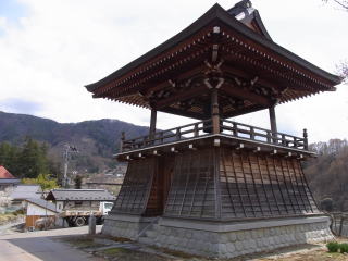 現在の鐘楼は嘉永六年(1853)の再建で、六本の柱をもつ珍しい形式です。柱の本数は「南無阿弥陀仏」の六字名号に因むといわれています。梵鐘は寛文七年(1667)鋳造の名鐘で、毎日時の鐘として用いられています。平成八年には「日本の音風景百選」に選ばれ、平成十年二月七日の長野冬季オリンピックでは、この鐘の音が開会の合図として全世界に響き渡りました。