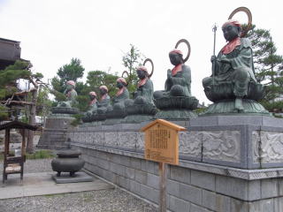 六地蔵は、我々衆生が輪廻を繰り返す六つの世界(六道)に現れて、迷いや苦しみから衆生を救って下さる菩薩です。向かって右から、地獄界・餓鬼界・畜生界・修羅界・人界・天界の地蔵菩薩です。地獄界の地蔵菩薩が蓮台から片足を踏み出しているのは、一刻も早く衆生を救いに行こうというお気持ちの顕れだといわれています。