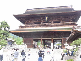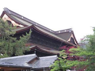 善光寺本堂は、皇極天皇元年(642)の創建以来十数回の火災に遭っており、現在の建物は宝永四年(1707)の再建です。間口は約24m、奥行きは約54m、高さは約26mあり、江戸時代中期を代表する仏教建築として国宝に指定されています。