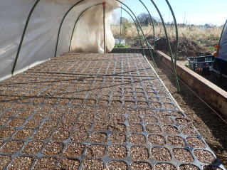 セルトレイなどを用いて育苗します。本葉2枚頃までは摘湿を保ち、その後は水分を控え、健苗を作ります。