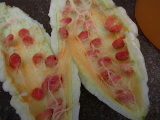 開花後、15〜20日目の若い果実を収穫します。モモルデシン」という独特の苦味成分が食欲を刺激し、ビタミンCが豊富に含まれるので」夏の栄養補給に好適です。