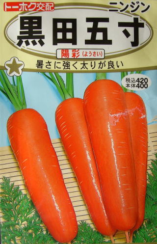 新黒田五寸タイプの交配種で、品質と味にすぐれ、暑さに強く主に夏まきします。長さ15cm位の鮮紅色できれいな円筒形になります。