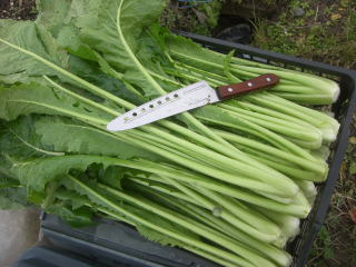 霜に2〜3回あわせた後草丈50cm位の中株で収穫し、かぶを切断した後一晩広げておきます。収穫直後に洗浄すると茎が折れやすく又茎の間に入っている土が取れにくいです。適当に数株まとめて紐などで茎元を縛り、株切断部に#状に切込みをいれ揉む様にして洗うと容易く土が落とせます。茎が太くなると漬けたあとの食感が良くなく、塩味も廻りにくく、見た目のバランスもいただけません。