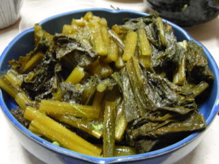 カブの仲間なので形のよいかぶがありましたら根を取り薄切りにして漬けても独特の辛味、甘味があり珍味?です。3月にはいると発酵が進みあめ色と同時にすっぱさも増してきますので、油で炒めると少し長く保存できます。