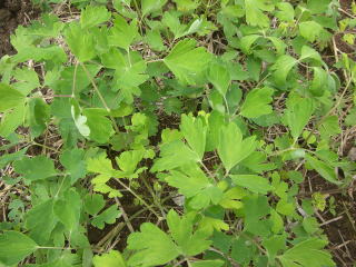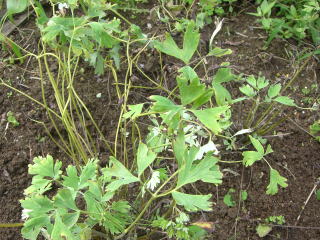 茎葉共に白みをおびた美しい緑色、花は後ろに筒状の距(ケヅメ)があります。