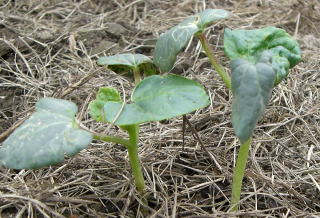 種まき、定植は十分暖かくなってからポット又は直蒔きします。種は表皮が硬いので、1昼夜水に漬けてから蒔くと発芽を早めることが出来ると言われているが、それ以上に重要なのは地温で、25℃以上を確保できないと水に漬けた効果は発揮できません。よって直播の時は5月中旬(関東内陸部)以降の種まきとなります。立枯病予防のために発芽後は多湿に注意し、土壌表面を乾かし気味に育苗します。