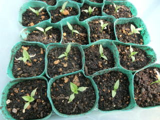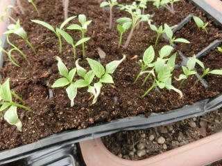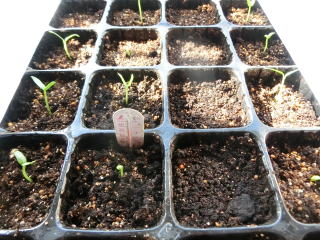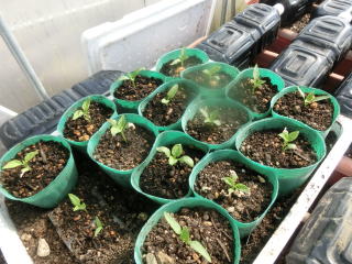 ジフィーセブンに2粒播きし間引きするか、箱に8p間隔に蒔き、1pほど覆土します。本葉が1.5枚の頃ポットに植え替え、その後、1番花が咲くころに畝間150〜180p、株間60pに植え付けます。