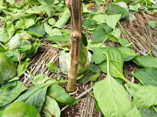 果実がソフトボール大、重さで200〜250g位が収穫の適期です。果実をすべて大きくしてしまうと、着果が悪くなることもあるので、実を若どりして株の負担を軽くすることも必要です。
