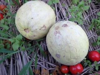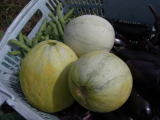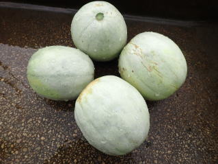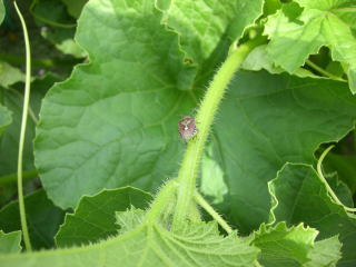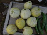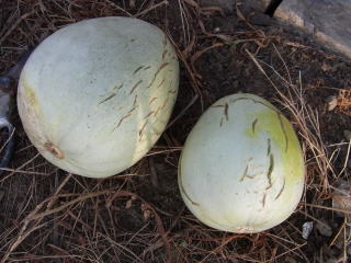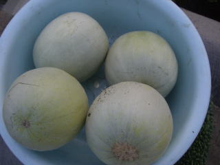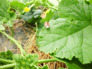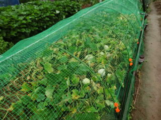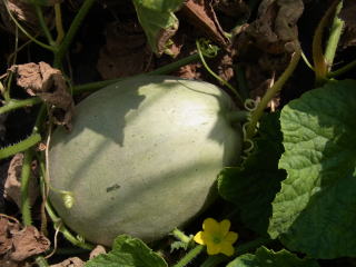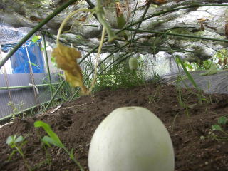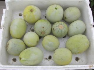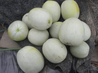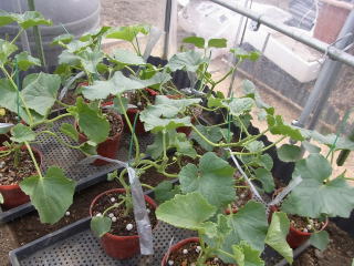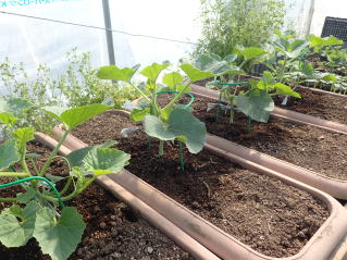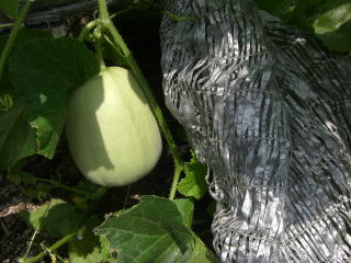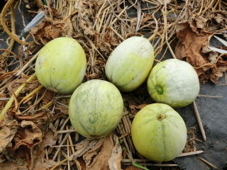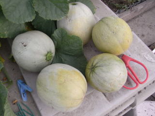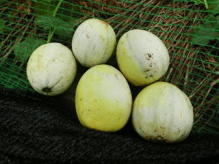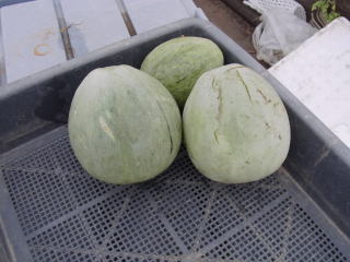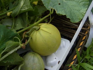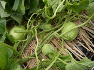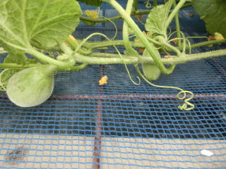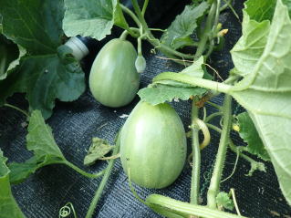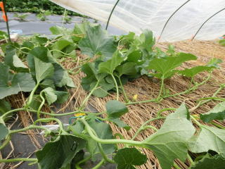 本葉6枚でつるを止め、2.5m×75p間隔でベットに定植します。子づるは4本伸ばし、20節前後で摘心します。果実は1つる3果が標準です。交配は朝のうちに行いますが、ミツバチなど訪花昆虫が多ければ不要です。整枝、摘果は適宜行います。開花後43〜48日前後、芳香が出始めたら収穫の適期です。