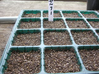 4〜5月頃播種しますが、発芽までは日数がかかります。本葉2〜3枚で3号ポットに移植し、その後5号ポットに再移植し本葉10枚くらいまで育苗し、株間40p位で定植する。トンネル栽培をお勧めします。