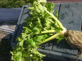 収穫となりますが自家消費には一株有れば良い位なので、他に配ったりしています。目下保存方法が課題です。家庭菜園で栽培するには栽培期間の長さからも、利用価値からもお勧めする野菜ではありません。最高気温を記録した熊谷地方で寒冷地型のセルリを真夏に栽培してみたい自己満足にすぎません。