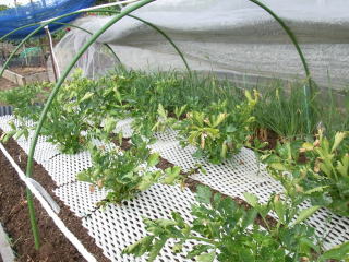 10月を迎えるころになると草丈も50〜60pになりますからトンネルも高くしなければなりません。途中で張り替えるより最初から高さの取れる支柱でトンネルを作っておくほうが便利。支柱の大きさは長さで210〜230pで二列植えが適当で、トンネル頂部の高さは75pは確保できます。支柱先の差し込み長さを最小限にするよう工夫してください。
