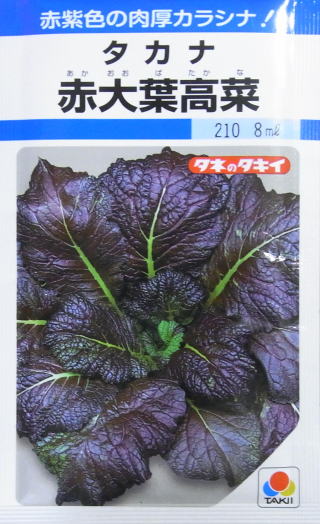 晩生型で高菜の代表種。葉にぢぢみがあり、周辺が紫赤色となります。茎が幅広で大きくきわめて多収性種です。丈夫で作りやすく土質を選ばず、家庭菜園に適し、出荷用としても好評です。箱、プランターなどでも楽に栽培できます。