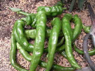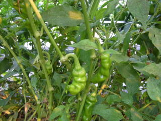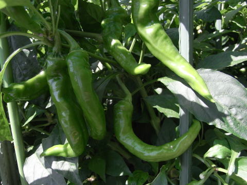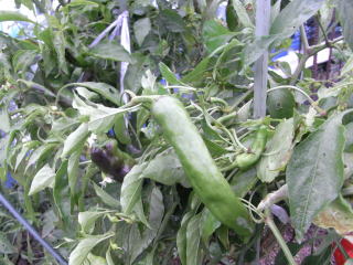 長さが15cm以上にもなる大果実と5cm前後の小果実とがあり、概ね大果実は辛味が無く甘みがあり、小果実は辛味が強い。普通とうがらし言われて思い浮かぶのはあの辛さですが、甘みとうがらしもこれから人気が出ると思います。果実は獅子唐と良く似ていますが、花落ち部がすんなり伸びているのがとうがらしで、むしろ凹んでいるのが獅子唐。