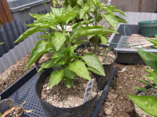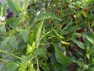 茎枝が折れ易いのも又同様でしっかりとした支柱が必要になります。完熟収穫する辛いとうがらしは株間25cm、草丈が60〜80cm位ですので草姿を両側から挟むように適宜支柱を立て、その間を紐やテープで連結しておくと風にも強く枝折れしませんでした。