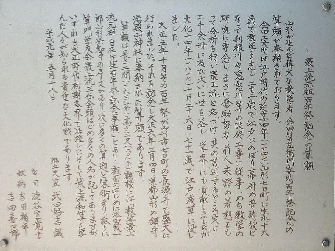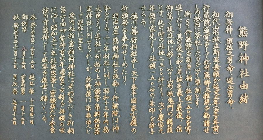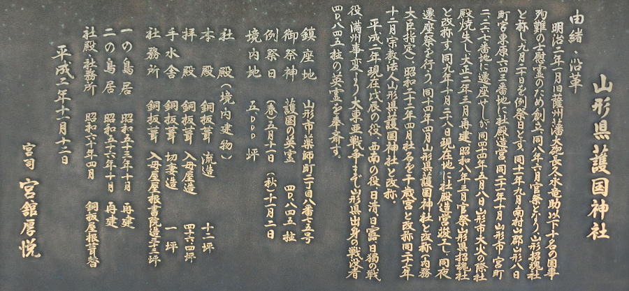 その後、代々の領主及び領民、最上家当主の信仰篤く、特に戦争のときはいつも霊験によって勝利をおさめ、山形の町を戦火より護る事が出来たので、「国家太平武門吉事之宮」とも呼ばれるようになり、桃山時代には社領壹万石を給せられたと伝えられております。郷民の信仰いよいよ篤く、山形北郷の総鎮守と崇められ、明治十二年八月十三日県社に昇格しましたが、終戦後は別表神社に列せられています。