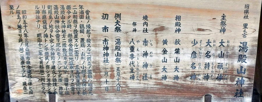 最上氏改易後の寛永七年、山形城主鳥居忠恒宮殿を造営、これ今の本殿と伝え、八双金具に鳥居家家紋「巻鶴」が彫られている。江戸時代、慶安元年以来御朱印四十八石を寄せられ、爾来、保科正之、堀田正亮、秋元涼朝、水野忠精等、歴代藩主から厚く崇敬される。
