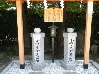この二つの石はおもかる石の名で親しまれている石です。向かって左の石がかぶの石(市神神社)と称し、商売繁盛、金運、株が上がるなどの経済的願を、右の石がうしの石(湯殿山神社)と称し、安産、子授け、各種試験合格、良縁・就職成就など生活的願を試します。