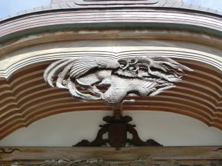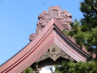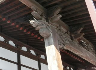 門柱の頂にあります獅子像は、アショカピラーとも言われ、紀元前三世紀ごろに、インドを最初に統一したマウリヤ王朝のアショカ王(在位 紀元前二百六十三年~二百三十二年頃)によって建立された像をモデルにしています。大王は、威厳を以て響き渡る獅子の吠え声を釈尊の説法に例えて、生命の尊さ、世の平和を説かれた仏教が、国の隅々に広まり、民の一人びとりに伝わることを念じてインド各地に建立されました。獅子像の下の台座には円形の法輪が四つ彫刻されています。これが今のインドの国章になっています。法輪の間には象、獅子、牛、馬が彫られています。象は花祭り(灌仏会 四月八日 釈迦の誕生日)の時、釈尊の御像を白い象に乗せて曳くという古事に依ります。獅子は釈尊の教えは獅子の吠え声の如く世界にとどろき渡る事に依ります。牛はインドで聖獣として大切にされることに依ります。馬は釈尊の出家にお供した愛馬を慈しむことに依ります。