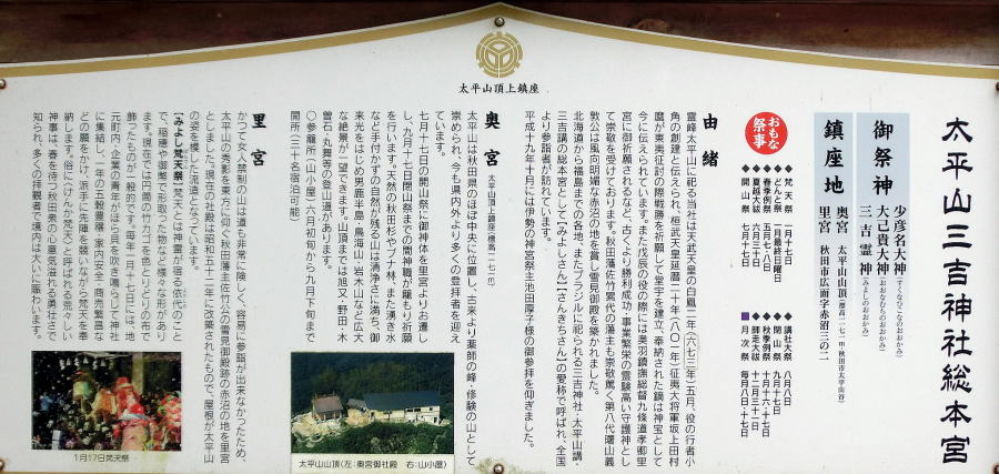 霊峰太平山に祀る当社は、天武天皇の白鳳二年(673)五月、役の行者小角の創建と伝えられ、桓武天皇延暦二十年(801)征夷大将軍坂上田村麻呂東夷征討の際、戦勝を祈願して堂宇を建立、奉納された御鏑は神宝として今に伝えられています。
