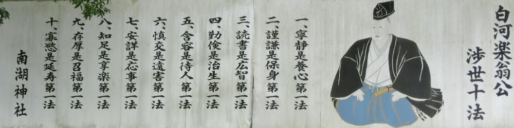 殖産振興では、養蚕の普及、植林、製紙、製陶、たたら(製鉄)の設置など、自給自足の基礎を確立した。文化では、日本最初の公園「南湖」の築庭、中世の白河の関の検証、集古十種、花月草紙等多くの著述、郷学校敷教舎、藩校・立教館の設置など、教育に意を注いだ。藩政は、「政者正也」を理念としておこなった。このため名君として領民の崇敬を受けるに至っている。