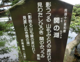 松平定信は、南湖二十七の景勝地を選び、一ヶ所ごとに和名・漢名、二つの風雅な名を付けました。例えば、和名「関の湖」→漢名「南湖」、和名「千世の堤」→漢名「使君堤」のように付けています。それらにちなんだ和歌や漢詩を交友のあった大名や公家・諸藩儒学者に依頼し、寄せられた自筆の和歌・漢詩を一石に刻み、文政三年(1820)に建立したのが、この「南湖十七景詩歌碑」通称南湖碑です。