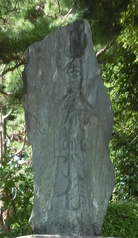 門柱横の三メートル余の高さを誇る名号石は、念仏の行者・徳本上人(1758〜1818)が當山で教化の記念として、文化十四年に建立されたものである。和歌の達人でもある徳本上人は、紀伊国日高の生まれ、不断念佛に精通し大乗仏教の奥義を究めてから各地を巡錫、多くの人達に法然上人の念仏の教えを広めた。
