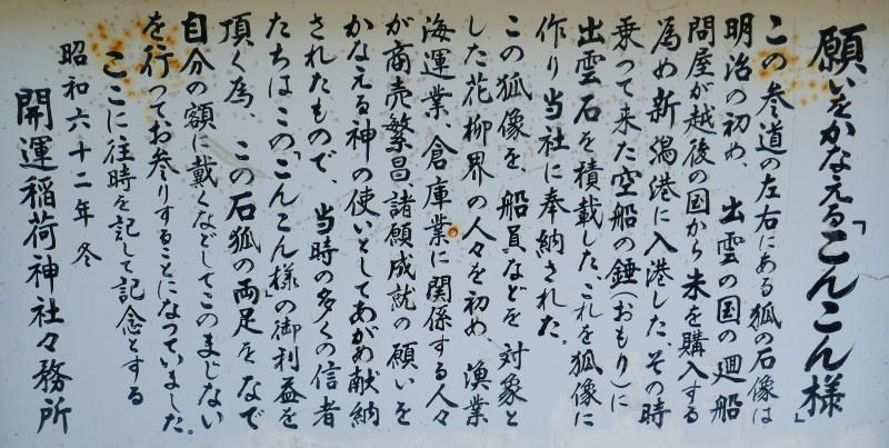 また現地の案内板には次の由来が標されている。(願懸け高麗犬と道楽稲荷様の由来)