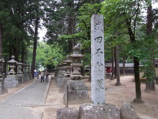 甲斐、・信濃両国の太守として早くから天下制覇の大志を抱き、川中島五度の大合戦に後、後北条氏と和し、越前の朝倉、近江の浅井や摂津本願寺と結び、室的幕府十五代将軍足利義昭の意をうけて、元亀三年、三万の大軍を率いて上洛の途につき、三方ヶ原に織田・徳川の連合軍を破り、更に三河の野田城を陥れて宿望ならんとしたとき、病を得て帰国の途中信州伊那の駒場で死去した。
