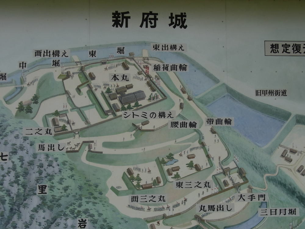 廃墟と化したこの城も、同年六月本能寺の変で織田信長が亡び、德川・北条両氏が甲州の覇権を争うと、家康はこの城を修築して本陣とし、我に五倍する兵を率いて若神子に布陣する北条氏直を翻弄して有利に導き、名城新府の真価を発揮したのである。