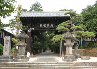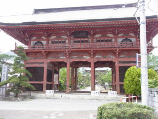 五間三戸の楼門式山門で、入母屋造りの構造を示すこの山門は、江戸時代中頃の宝暦四年(1754)の大火により、本堂と共に焼失したが、本堂に先立って再建され、明和四年(1766)に上棟式が行われた。両脇に仁王像を安置し、二階部分は、手すり付の板廊下がめぐらされ、内部には仏壇が置かれている。巨大な朱塗りの丸柱と白壁、銅板葺の屋根などからかもし出される雰囲気は、本堂の壮大な建築によく調和した山門ということが出来る。